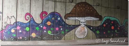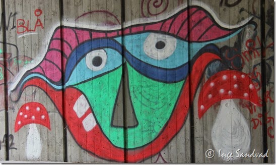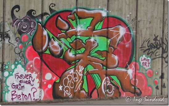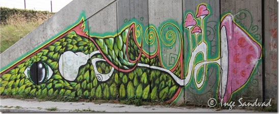 Jeg aner ikke om graffitien herunder er lovlig eller ulovlig, jeg synes at de store malerier er meget sjove, men jeg bryder mig ikke om de tacs der også er malet på betonvæggen. I min optik får de hurtigt en graffitivæg til at ligne slum.